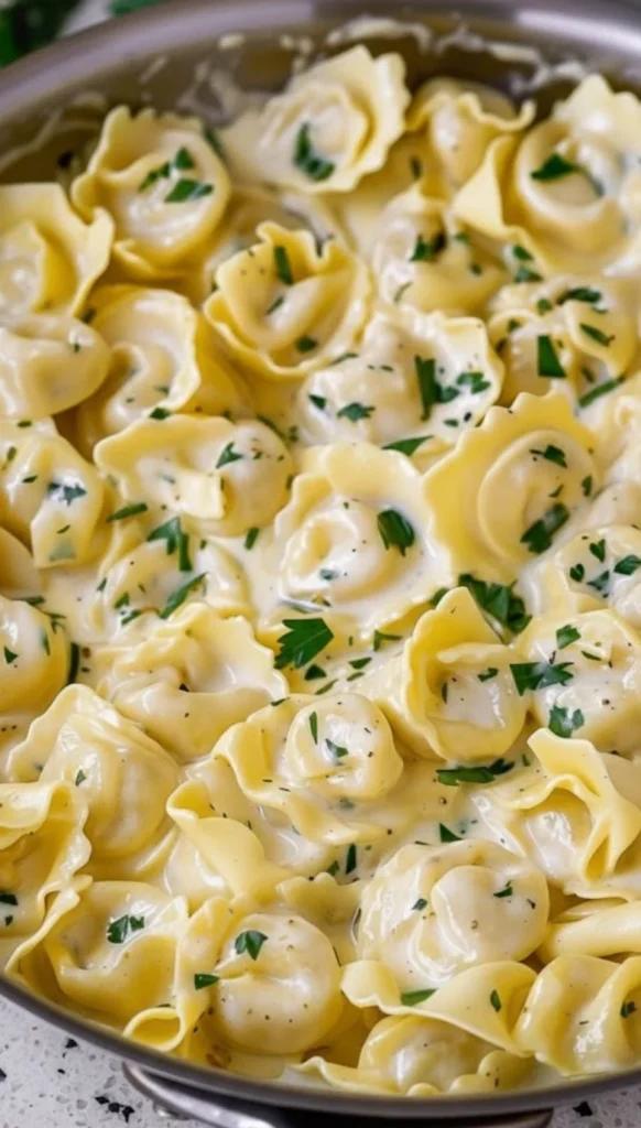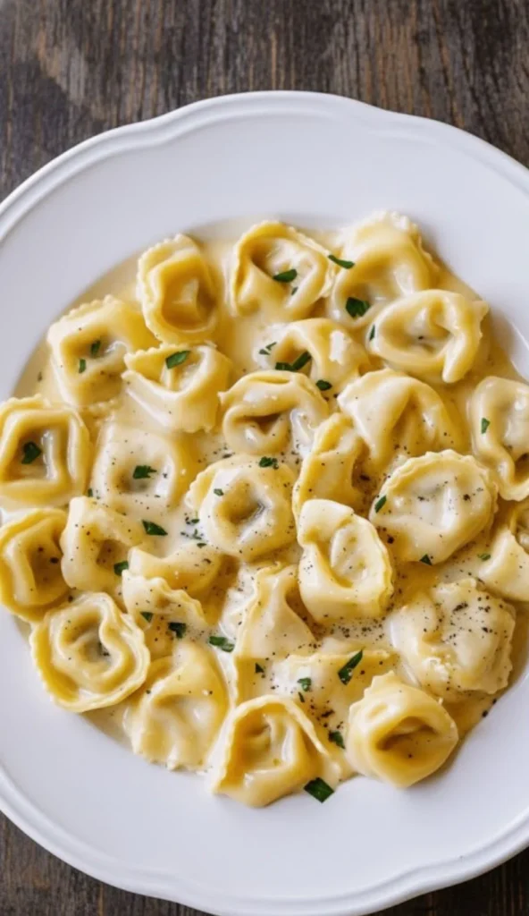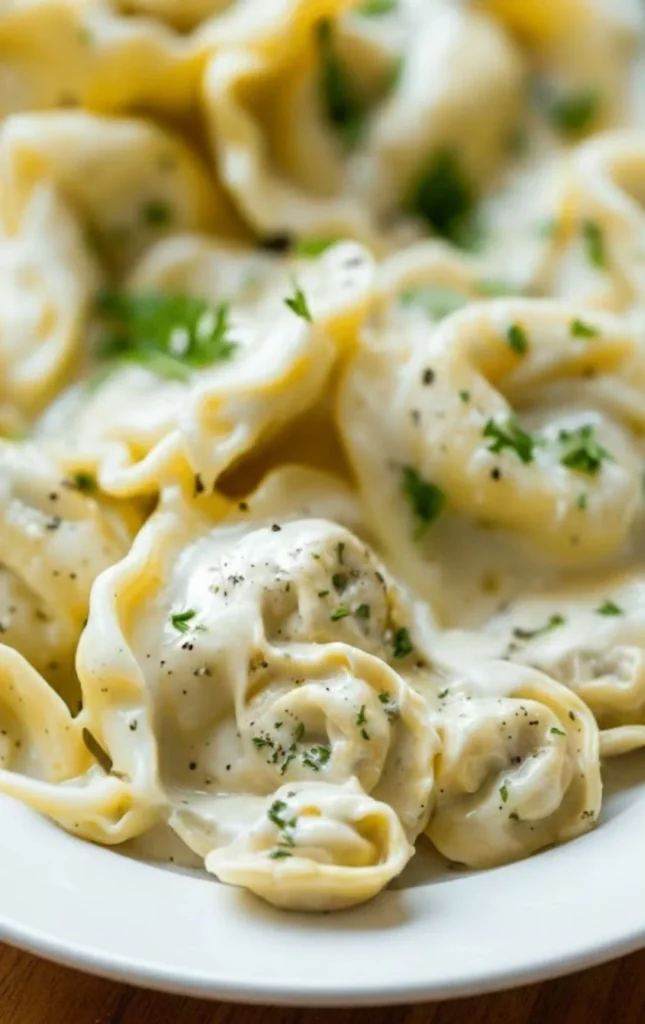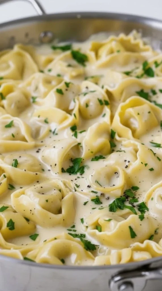 Decadent Texture: The heavy cream and fresh-grated cheese create a luxurious “cling” that coats every curve of the tortellini.