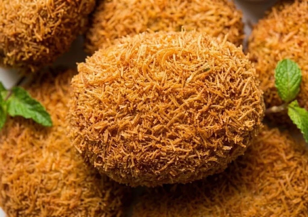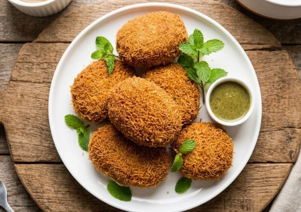 • Bread the Cutlets: Dip each patty into the beaten egg wash, then dredge in the crushed vermicelli or panko. Press firmly so the coating adheres.