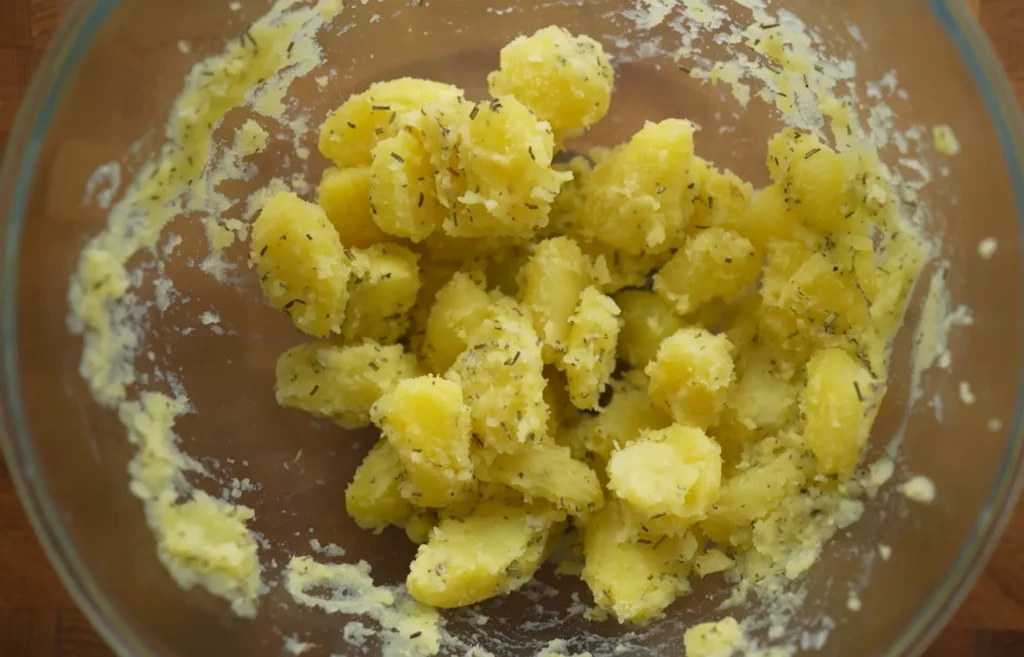 - Boil salted water with the baking soda. Simmer the potato chunks for 10 minutes until soft enough to pierce with a knife. Drain and add them to a bowl with oil and rosemary. The most important step: Shaking the bowl vigorously for 30 seconds to create a “potato slurry” on the surface. These craters are what turn into crispiness in the oven