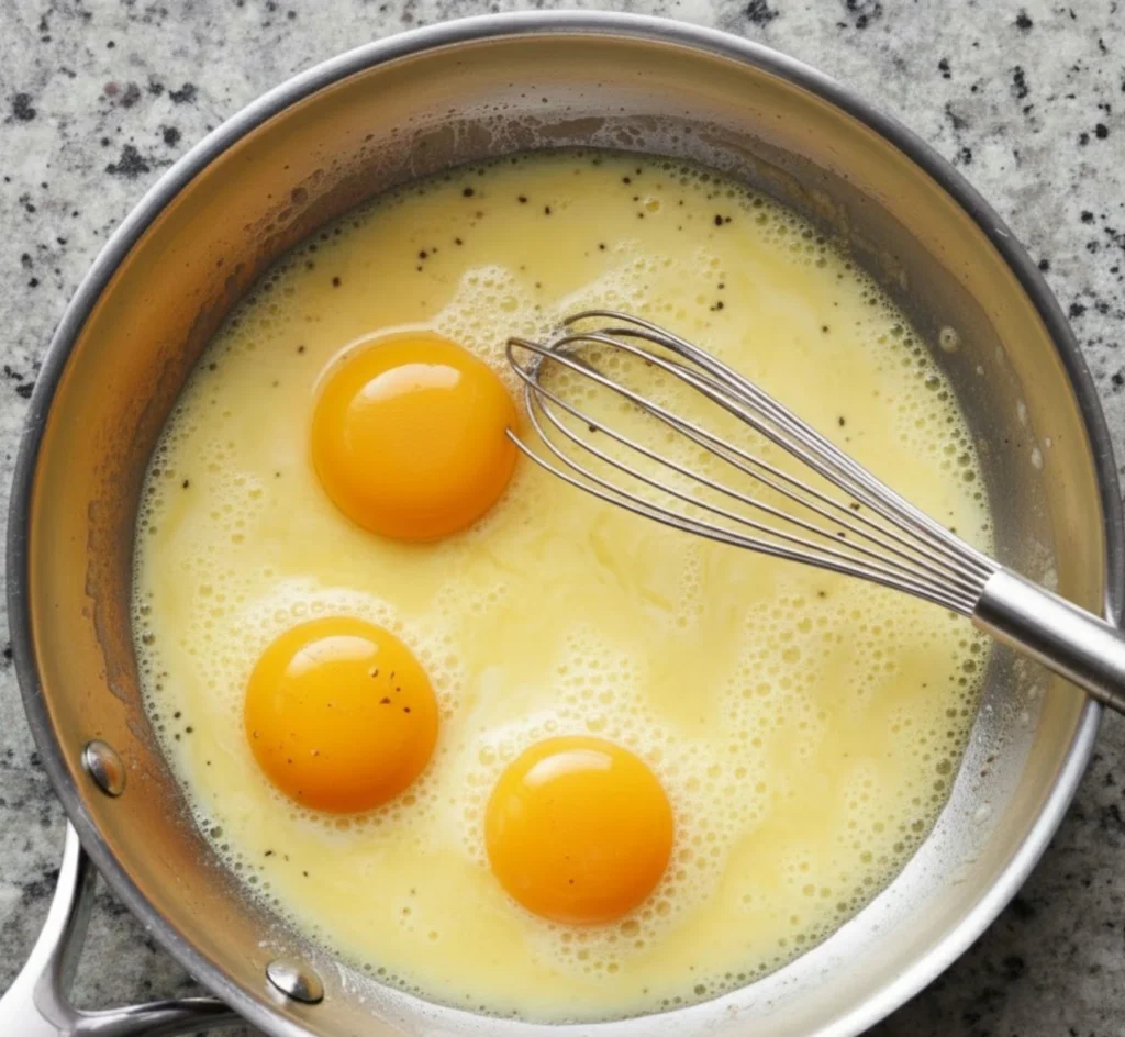 - Pour the eggs into the pan, let them set briefly, then gently push the edges inward.